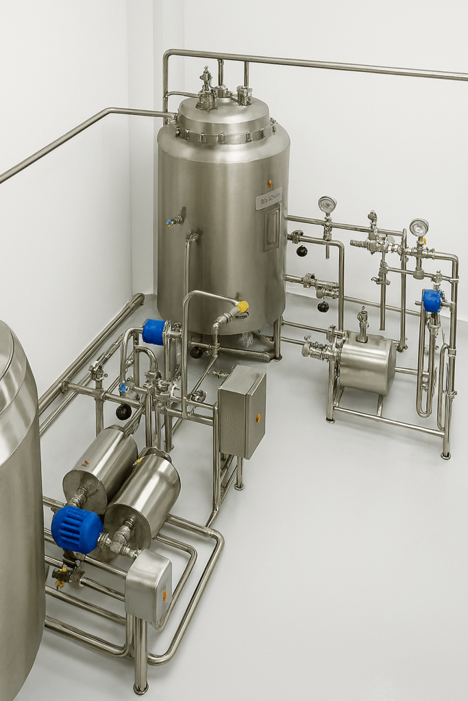 After RO generation, the treated water is stored in sanitary-grade storage tanks and distributed to different user points through loop systems, often using SS316L electropolished pipelines and sanitary pumps.