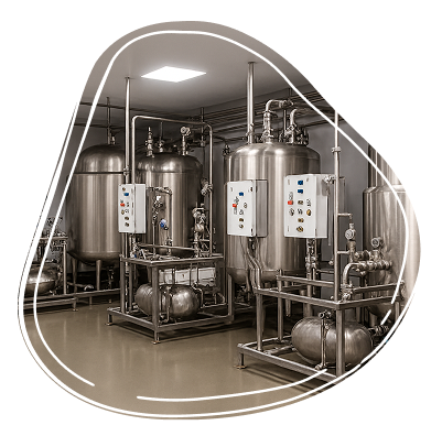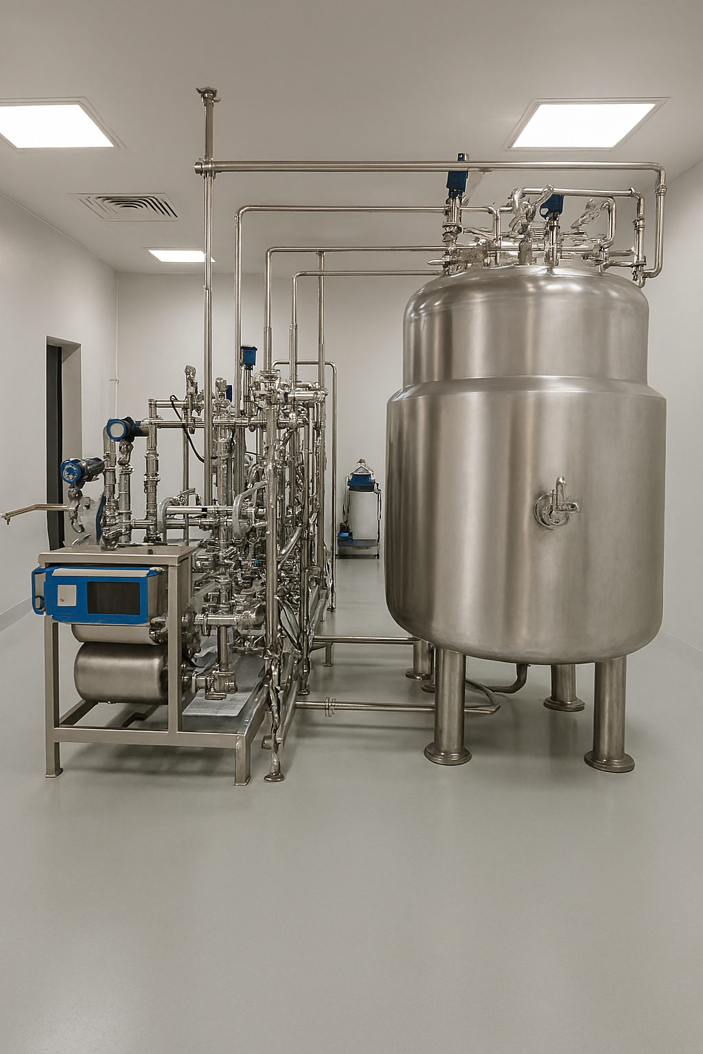 - Storage tanks with 0.2 µm hydrophobic vent filters and spray ball cleaning.